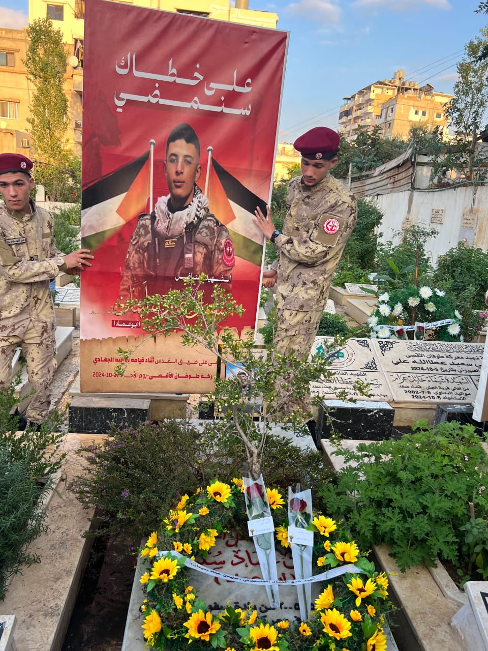 اليوم الاربعاء 29 / 10 / 2025 بحضور قيادة الجبهة الشعبية في لبنان ومنطقتي البداوي ونهر البارد وحشد من الرفاق والرفيقات وكادر وانصار الجبهة وعوائل الشهداء وفصائل المقاومة واللجان الشعبية الفلسطينية واحزاب وقوى وطنية لبنانية ولجنة اصدقاء الاسير يحيى سكاف وفعاليات ووجهاء واهالي المخيم والجوار تقدم المسيرة صور الشهداء واعلام الجبهة وفلسطين وعند وصول المسيرة الى المقبرة الجديدة في المخيم وبعد الوقوف دقيقة صمت وقراءة الفاتحة على ارواح الشهداء وضعت قيادة الجبهة الشعبية ومسؤولي الفصائل وردة حمراء عربون وفاء على اضرحة الشهداء. سليمان عماد سليمان ويوسف مبارك وتوفيق زعرورة ومحمد ياسين ومحمد ايوب و احمد طرابلسي وسعيد عطالله علي وعائلته ومن ثم تحدث خليل موسى مرحبا بالحضور ومتحدثا عن المناسبة.