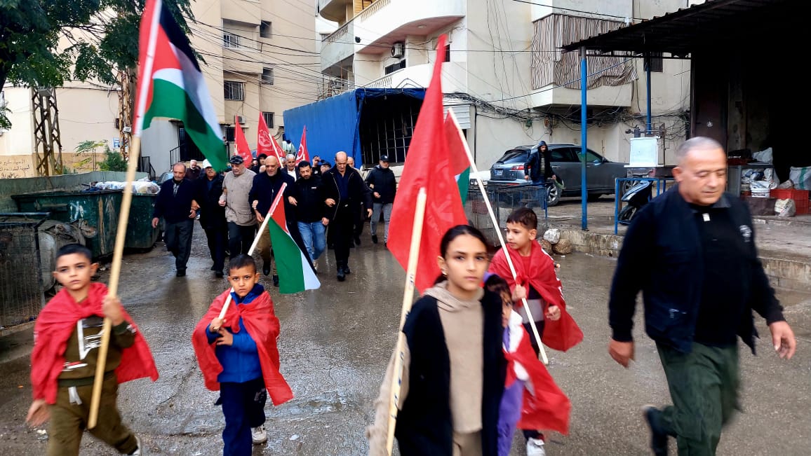 وتقدّم المسيرة عضو قيادة الجبهة أبو جابر اللوباني ، وعضو قيادة الجبهة في لبنان أبو ماهرغنومي وقيادة وكوادر الجبهة وحشد من الرفاق والرفيقات وفصائل المقاومة واللجان الشعبية الفلسطينية ولجنة اصدقاء الاسير يحيى سكاف وفعاليات المخيم والجوار كما شارك كشافة الجبهة برفع الأعلام وحملة الإكليل وذلك اليوم الاربعاء الموافق في ١٠ كانون الاول ٢٠٢٥