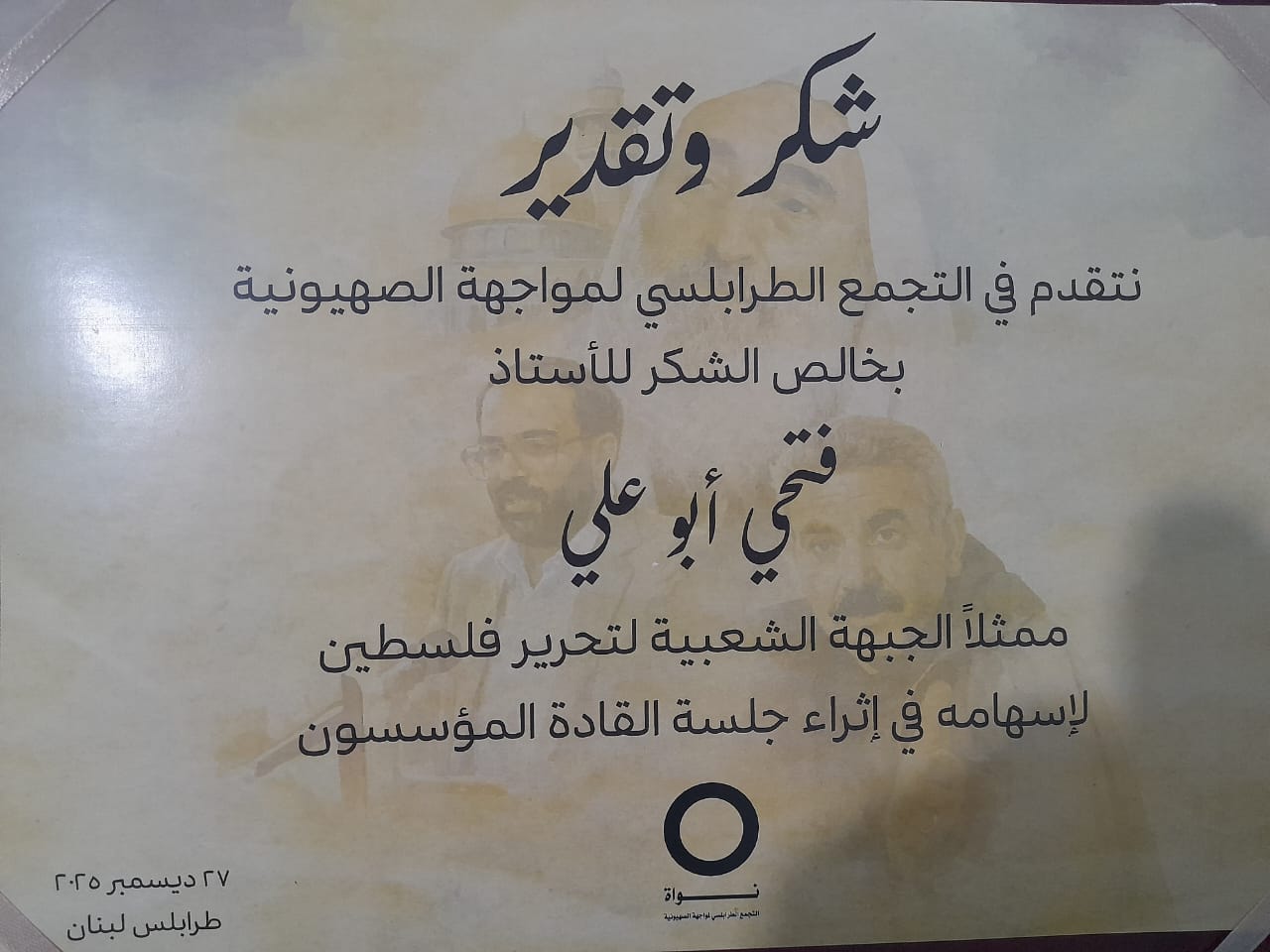 أقام التجمّع الطرابلسي لمواجهة الصهيونية لقاءًا حواريا تفاعليّا في الرابطة الثقافية_طرابلس بعنوان “القادة المؤسسون” حيث تم عرض سيرة كل من: الدكتور فتحي الشقاقي (حركة الجهاد الإسلامي) الدكتور جورج حبش (الجبهة الشعبية لتحرير فلسطين) الشيخ أحمد ياسين (حماس) بحضور رئيس الرابطة الثقافية الاستاذ رامزي فري والاعلامي عماد العيسى ورئيس لجنة اصدقاء الاسير يحيى سكاف الاستاذ جمال سكاف وحشد من الشباب الداعمين للقضية الفلسطينية في البداية تحدث الاستاذ راشد النابلسي عن الهدف من الندوة.