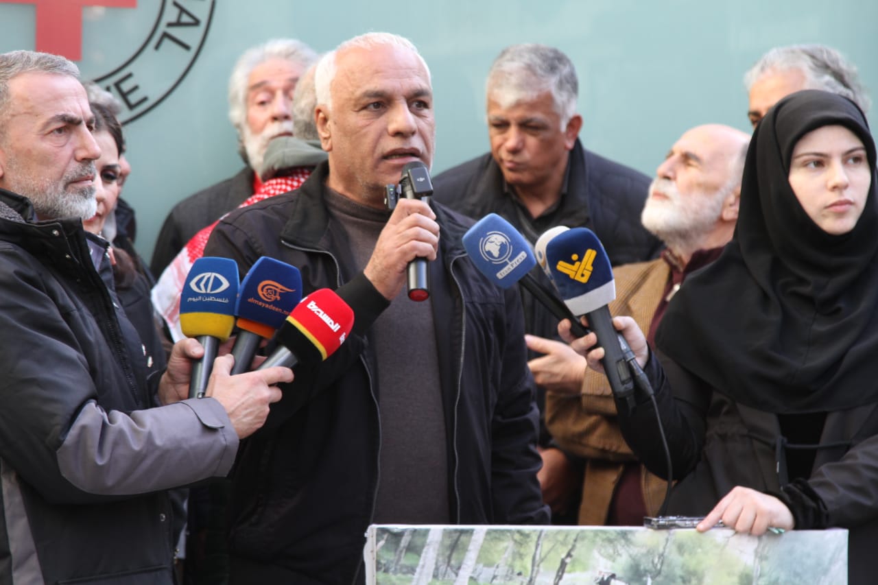 كلمة لجنة الاسرى والمحررين للجبهة الشعبية لتحرير فلسطين القاها مسؤولها في لبنان فتحي ابو علي قال فيها نلتقي اليوم امام اللجنة الدولية للصليب الاحمر في بيروت لنعرب عن اسنادنا وتضامننا مع الاسرى الفلسطينيين واللبنانيين والعرب في سجون الاحتلال الصهيوني الذين يعانون اوضاعا صحية وانسانية صعبة في ظل صمت عربي ودولي وانساني مريب ويجري كل ذلك امام مرئى ومسمع المنظمات الدولية والانسانية وحقوق الانسان دون ان يحركا سلكنا او ان يقوموا بواجباتهم الانسانية تجاه الاسرى