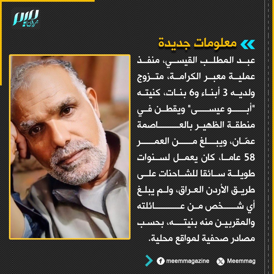 قُصف بيته، واستُشهدت زوجته الّتي تسنده في سيره، وابنه الأكبر المهندس الزّراعيّ الّذي كان يهتمّ بالأرض، وابنته معلّمة الجغرافيا، ولم يتبقَّ له من ذكرياتٍ غير تلك الغرفة الباردة.