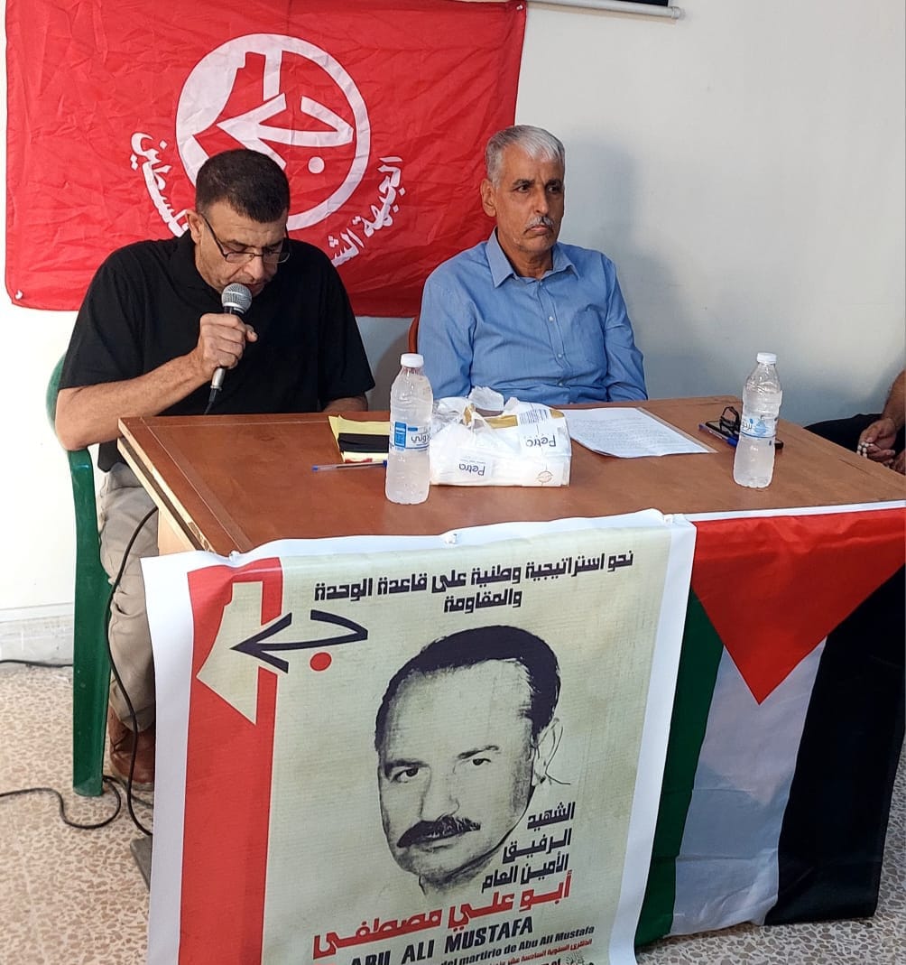 وتابع قائلا أن الشهيد أبو علي كان مدرسة في البناء التنظيمي والمقاوم وفي القدرة على توحيد القوى الفلسطينية ومحاور وحدوي فلسطيني لذلك كان قرار شارون وعصابته إغتياله عبر الغارة الإجرامية على مكتبه . ولكن الجبهة كان لها ردها النموذجي المقاوم بتصفية مجرم الحرب زئيفي لتقول أن المقاومة مستمرة حتى طرد الإحتلال عن أرضنا موجها تحية مجد للأسرى وخصوصا أبطال مجموعة الثأر يتقدمهم الأمين العام أحمد سعدات.